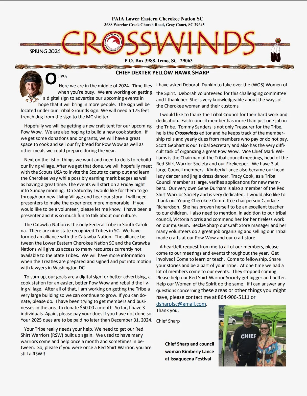 Crosswinds Crosswinds Newsletter Spring, 2024 Read Crosswinds Newsletter Summer, 2024 Read Crosswinds Newsletter Winter, 2024 Read Subscribe To Crosswinds Sign up with your email address to receive news and updates from the Lower Eastern Cherokee Nation. Email Address Sign Up We respect your privacy. Thank you! Crosswinds Editor, Tommy Sanders